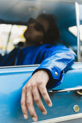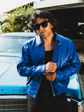 Each jacket is cut from premium full-grain leather, naturally tanned to achieve that deep electric cobalt hue — a tone that shifts subtly with light, catching both matte and shine in the same breath. The surface is soft yet structured, designed to mold to the wearer over time.