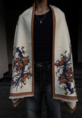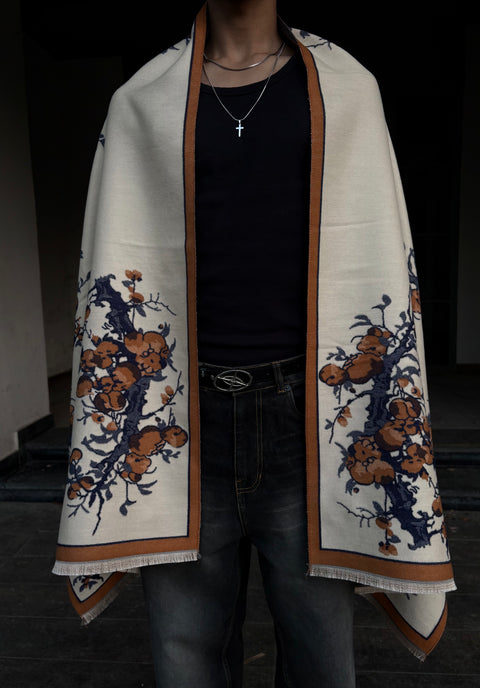 Born from the blend of art and comfort, The Elysian Drape is crafted from an ultra-soft silk blend that feels weightless yet grounding. Its design draws from ancient botanical patterns — detailed florals in muted navy and burnt ochre — framed by a warm border that balances serenity with strength.